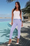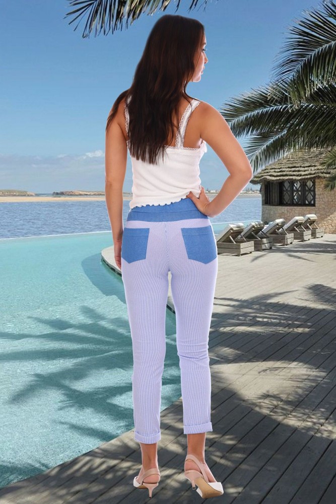 Брюки прилегающие в мелкую полоску, длина 7/8, на манжете. Пояс, отделка по бокам, сзади накладные карманы и кокетка из отделочной ткани, имитирующей джинс.