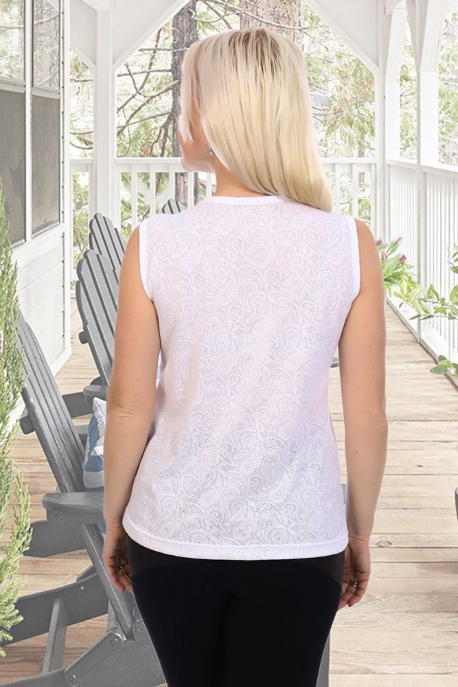 Изделие выполнено из лёгкой ажурной кулирки с гипюром. Ткань очень приятная к телу. Футболку можно носить как под одежду, так и самостоятельное изделие. Горловина украшена большой кружевной вставкой. Благодаря наличию в составе небольшого количества полиэстера, изделие не деформируется после стирки. Ажурный рисунок может быть разный (кружочки, цветы, сердечки и т.д.)