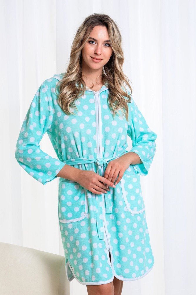 Удобный женский халат из легкой хлопковой махры. Модель с застежкой на молнии, с капюшоном, двумя карманами по бокам и длинным рукавом