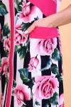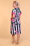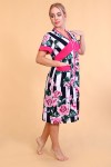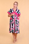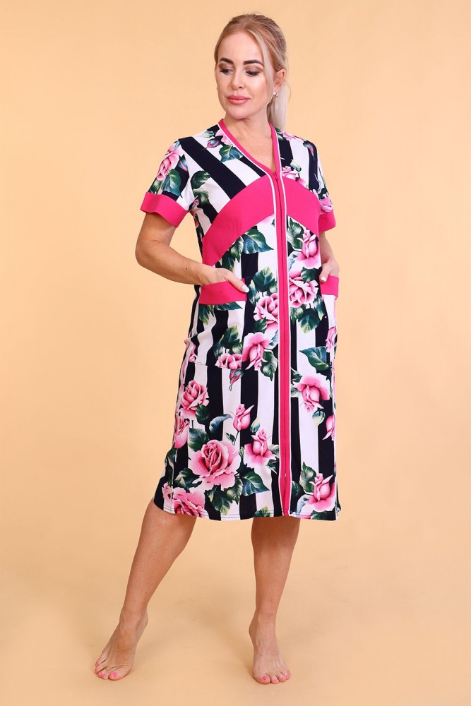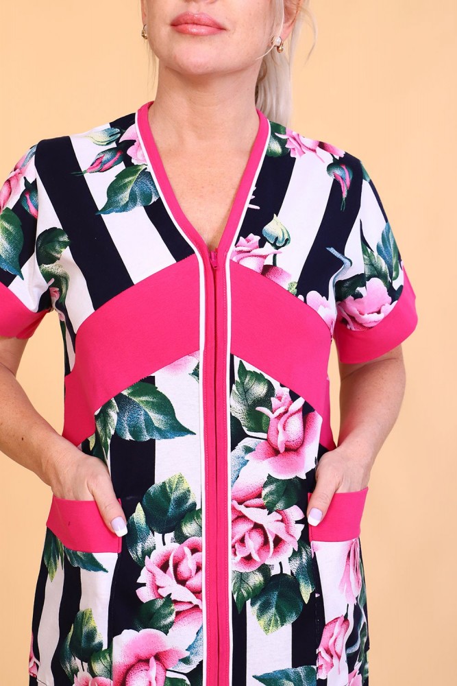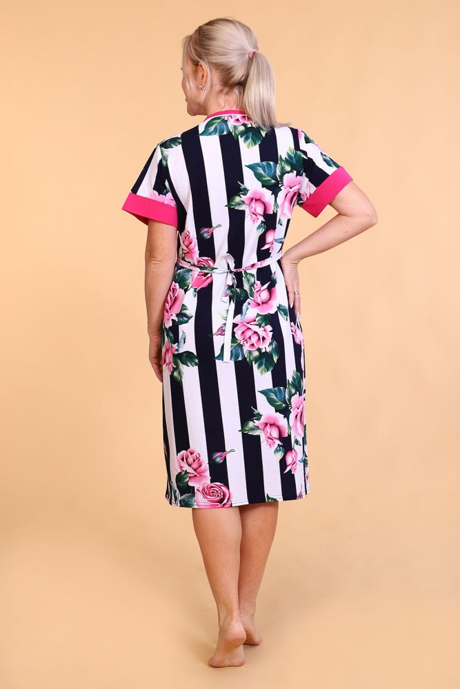 Оригинальный женский халат с красивым принтом на ткани в виде полос и роз. Выполнен из кулирки, с двумя карманами, с поясом, рукава чуть выше локтей, общая длина приблизительно до коленей. Очень приятный к телу халат