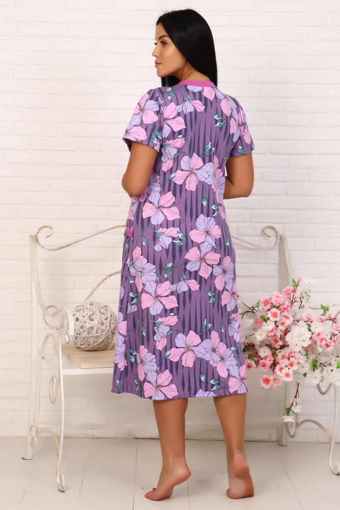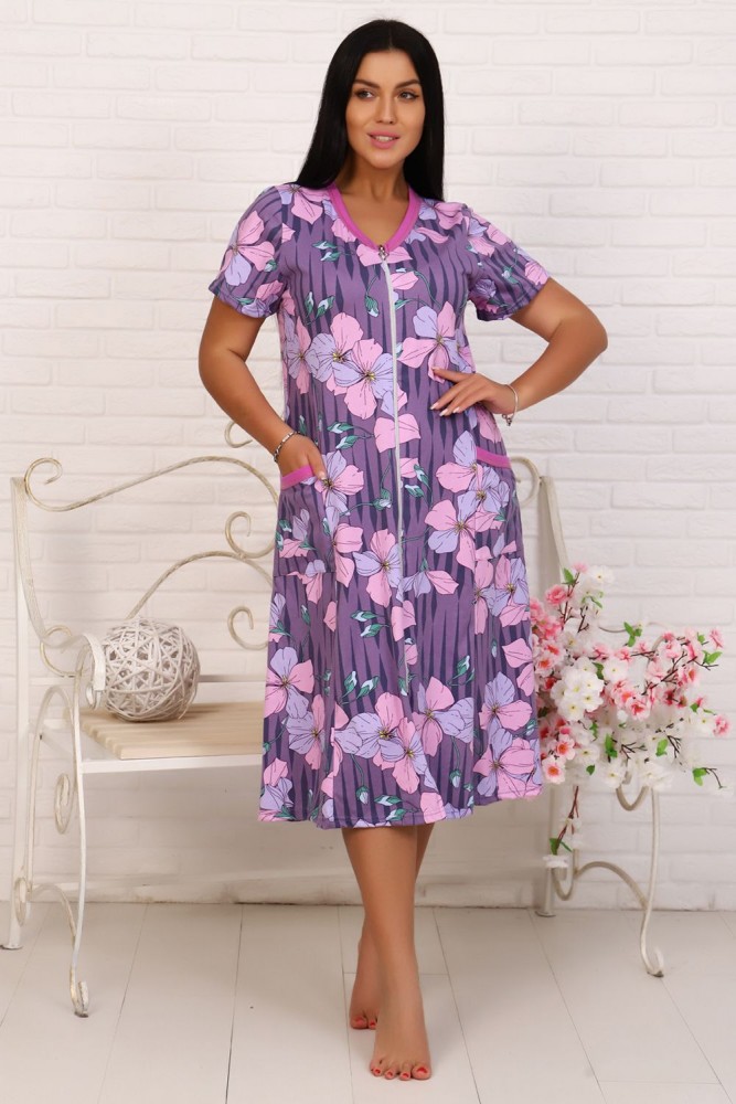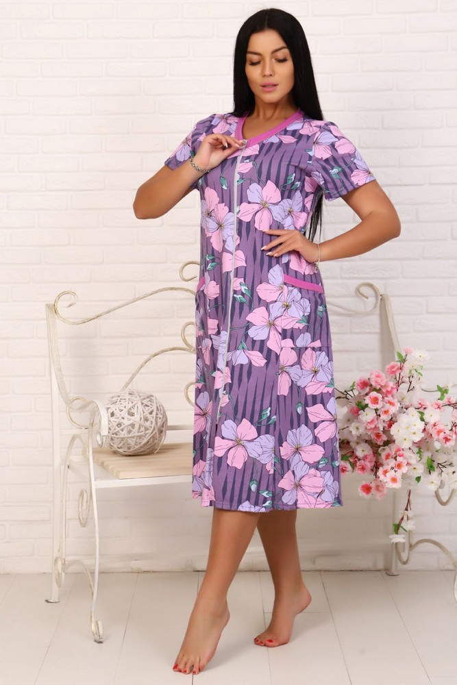 Халат женский из кулирки с нежно-сиреневым рисунком. Короткий рукав. Горловина и карманы - однотонная отделка кантом