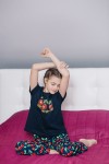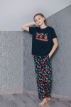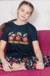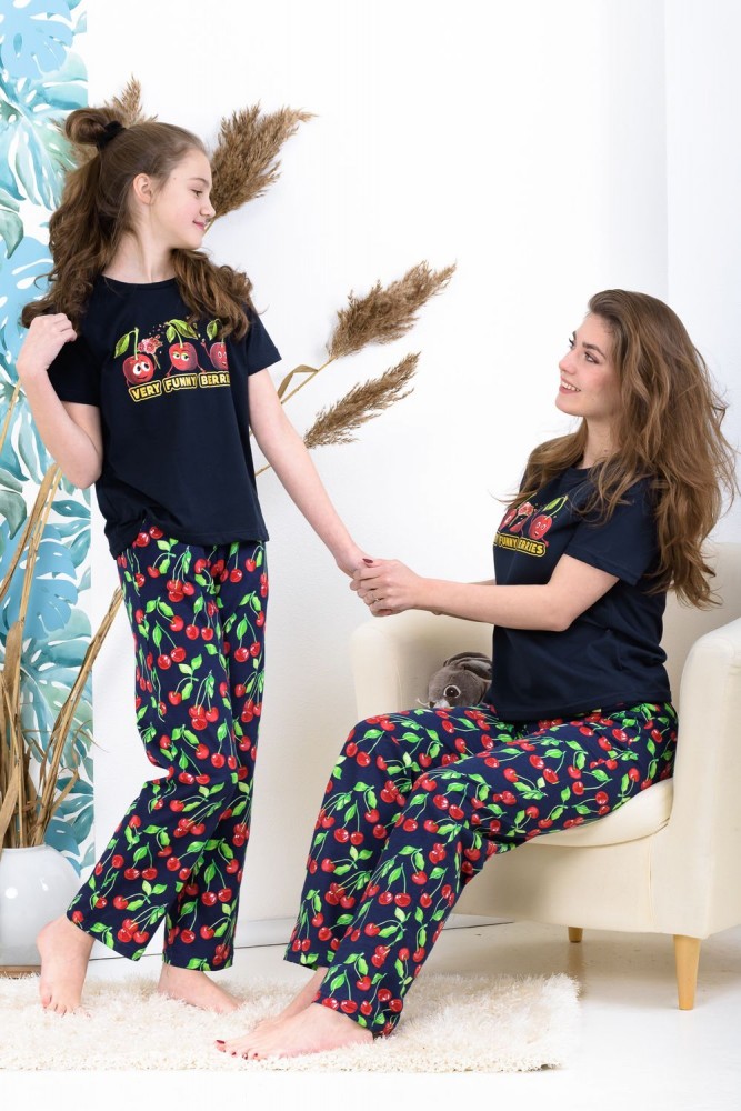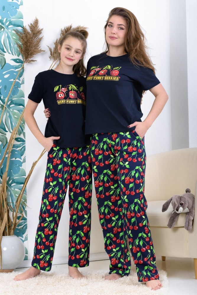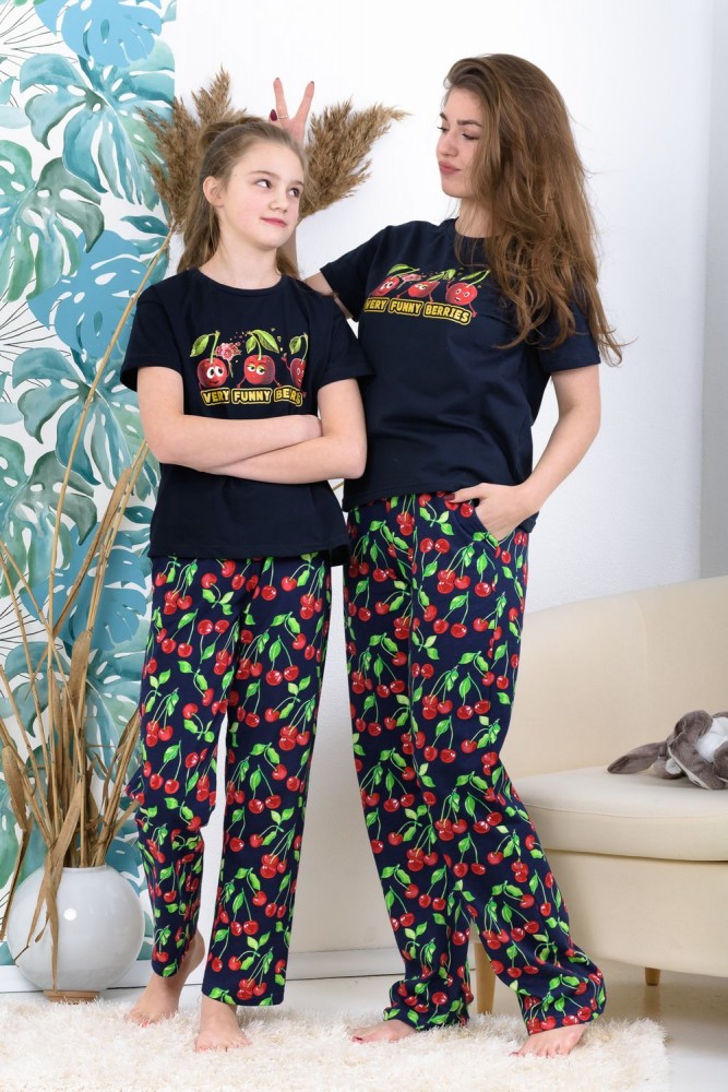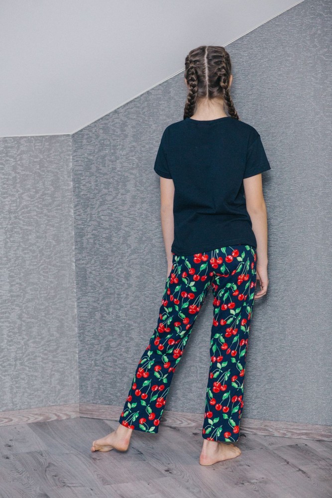 Костюм для подростков с композицией "Забавные вишенки". Футболка свободного кроя, укороченная, со спущенным плечом. Брюки длинные, свободные на широком поясе с карманами. Рекомендуется деликатная стирка