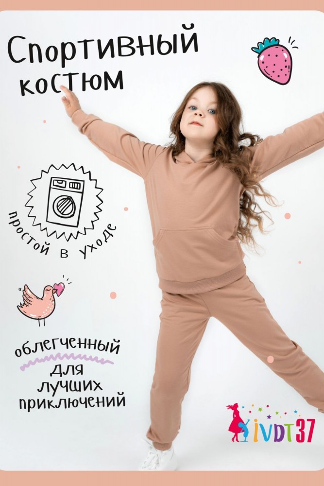 Костюм для девочек дошкольного и младшего школьного возраста. Костюм состоит из толстовки и штанов. Костюм из трикотажного эластичного хлопкового однотонного полотна футер. Толстовка с капюшоном, с длинным рукавом на манжете и поясе из основного полотна. На переде толстовки расположен карман-кенгуру. Штаны с боковыми карманами, на манжетах и поясе из основного полотна.