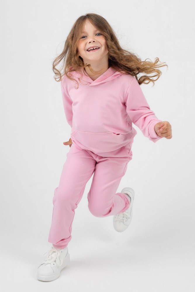 Костюм для девочек дошкольного и младшего школьного возраста. Костюм состоит из толстовки и штанов. Костюм из трикотажного эластичного хлопкового однотонного полотна футер. Толстовка с капюшоном, с длинным рукавом на манжете и поясе из основного полотна. На переде толстовки расположен карман-кенгуру. Штаны с боковыми карманами, на манжетах и поясе из основного полотна.