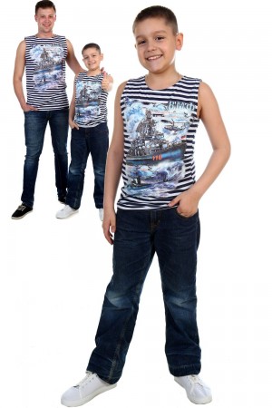 Майка из кулирки для мальчиков. Майка-тельняшка с принтом в виде изображения атомного ракетного крейсера, двух ракетных подводных крейсеров стратегического назначения и авиации. Обратите внимание, оттенок полосы может отличаться от представленного на фото. Может быть парой мужской майке Крейсер (продается отдельно). Размеры от 30 до 42. Есть розница.