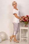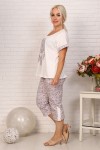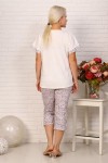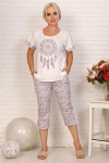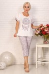 Удобная женская пижама из кулирки. Верх изделия выполнен из однотонной ткани. Футболка с округлым вырезом горловины обработанной окантовкой, линия плеча спущена, цельнокроеный рукав отделан манжетой, изделие украшено принтом. Капри длиной примерно до середины голени из ткани с рисунком с удобными глубокими карманами и притачным поясом, сбоку внизу брюк сделаны разрезы со шлицей. Пижама отлично подойдет для сна и отдыха.