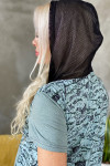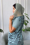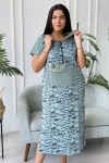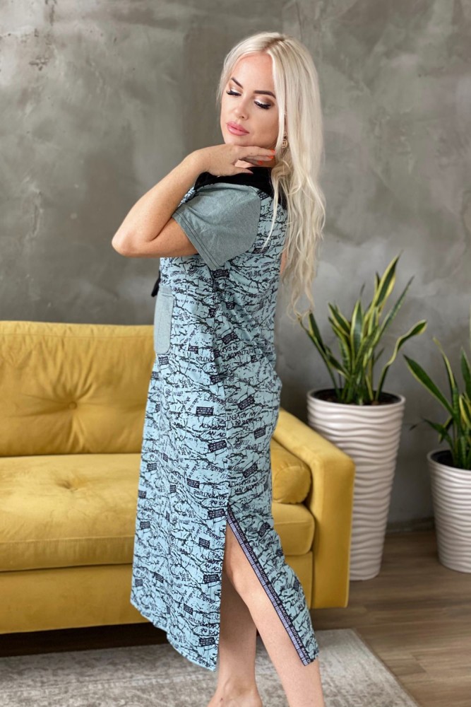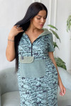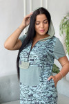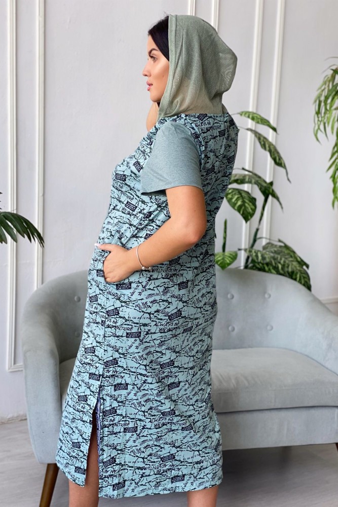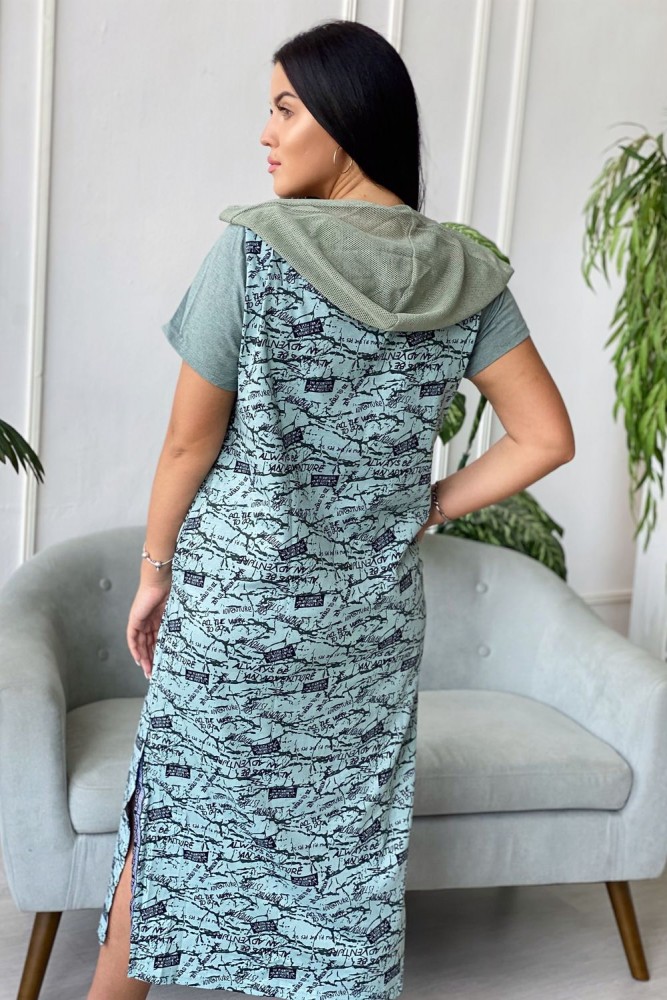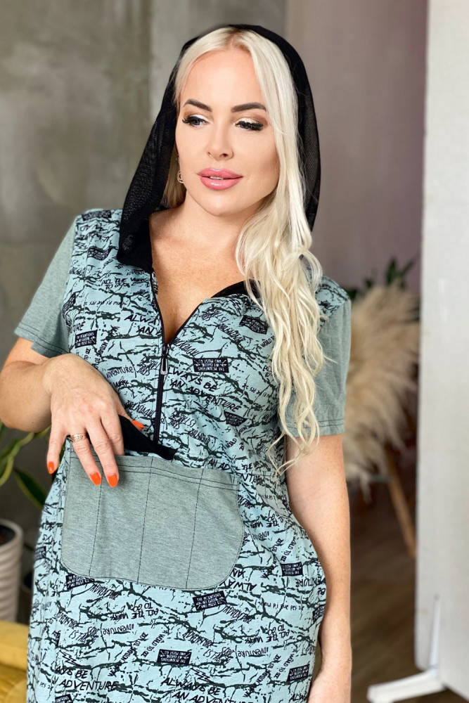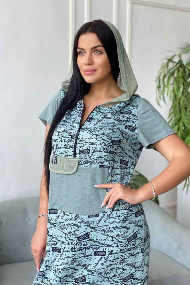Платье женское прямого силуэта. Рукав втачной короткий. Верхняя часть полочки застежка на тесьму молнию. В нижней части полочки широкий накладной карман с клапаном. Капюшон и клапан из х/б сетки. В боковом шве внутренние карманы и разрезы с декоративной тесьмой. Цвет сетки капюшона может быть черного или зеленого цвета.