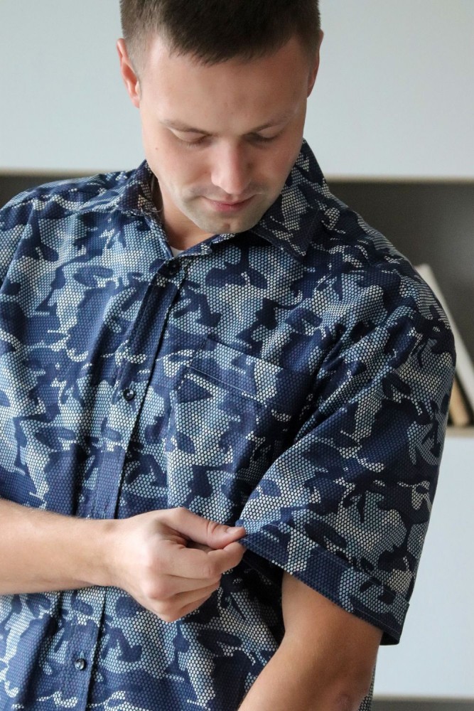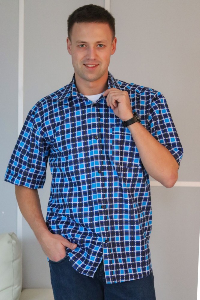 Мужская рубашка с коротким рукавом. Ткань бязь 100% хлопок. Модель свободного кроя, дополнена одним карманом с цельнокроеной планкой. Планка на полочке цельнокроеная, застегивается на пуговицы. Плечо приспущено, рукав с цельнокроеной планкой. Воротник на стойке, проложен флизелином с отстрочкой. Низ изделия застрачивается швом вподгибку при помощи специального приспособления. Внимание! Данный товар по цвету не подбирается.