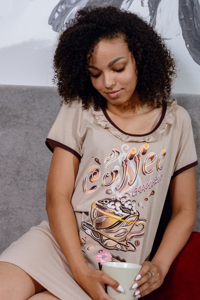 Ночная сорочка с оригинальным кофейным принтом. Горловина оформлена оборкой.