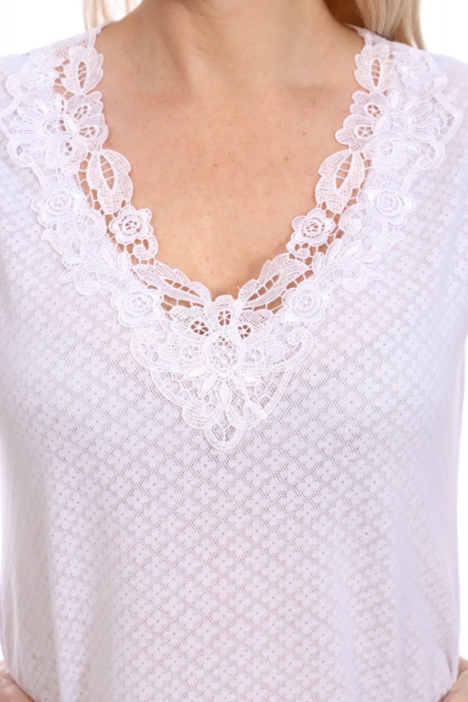 Изделие выполнено из лёгкой ажурной кулирки с гипюром. Ткань очень приятная к телу. Горловина украшена большой кружевной вставкой. Благодаря наличию в составе небольшого количества полиэстера, изделие не деформируется после стирки. Ажурный рисунок может быть разный (кружочки, цветы, сердечки, и т.д.)