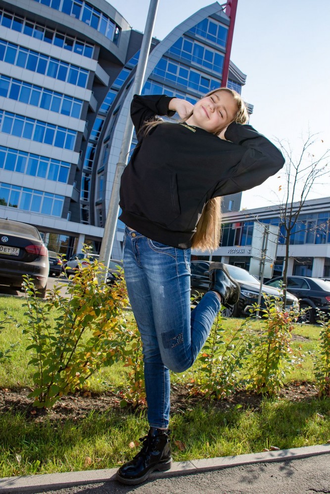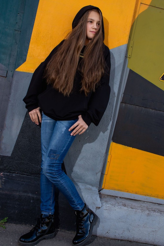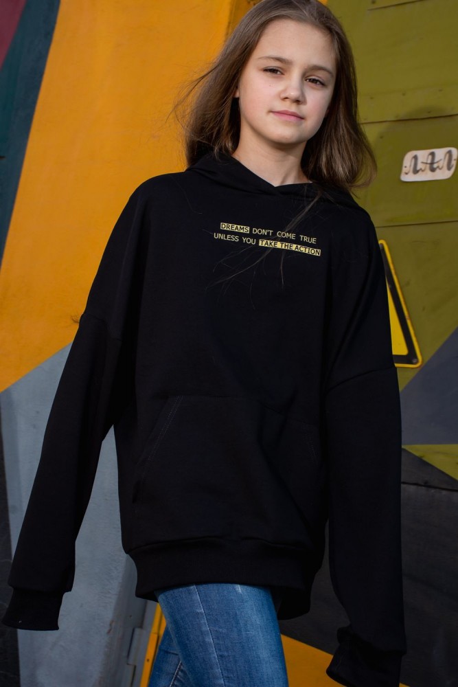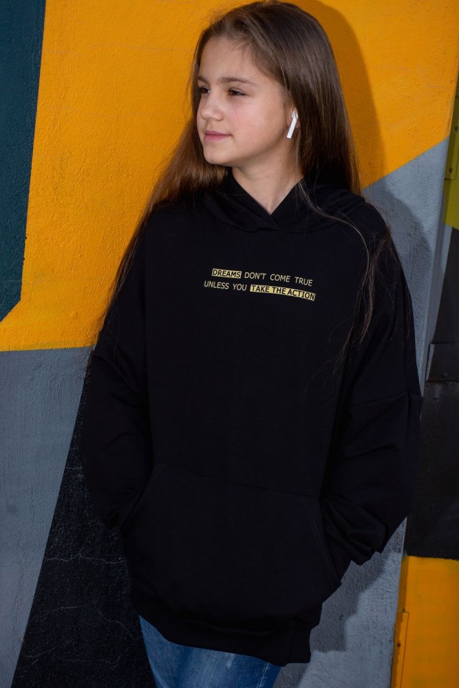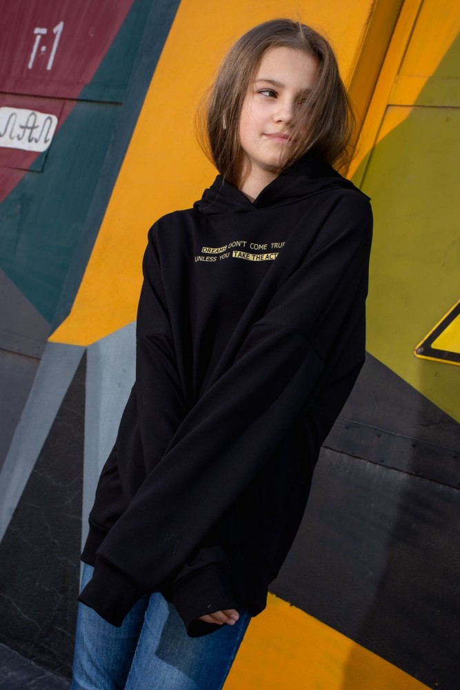 Современная толстовка для подростков с оригинальной печатью: "Мечты не сбудутся, пока не сделаешь первый шаг". На модели представлено изделие 38 размера. Рост девочки 150 см. Очень свободный и удобный крой, сильно спущенная пройма. Большой карман "кенгуру". Рукава удлинённые. В измерениях длина рукава указана от шва втачивания капюшона. Манжеты на изделии изготовлены из качественной ткани кашкорсе.