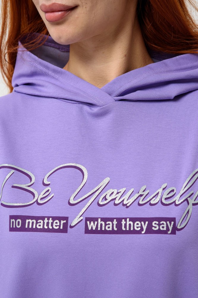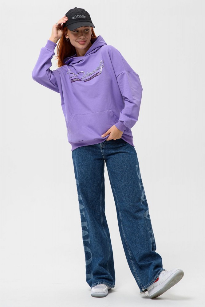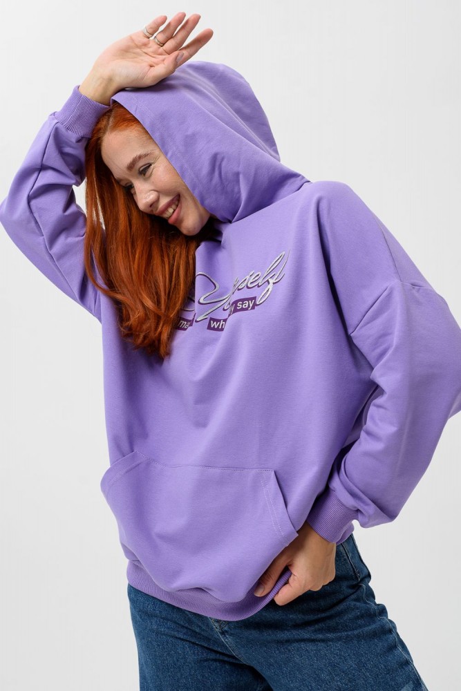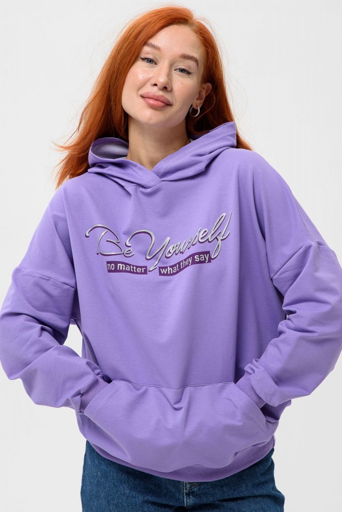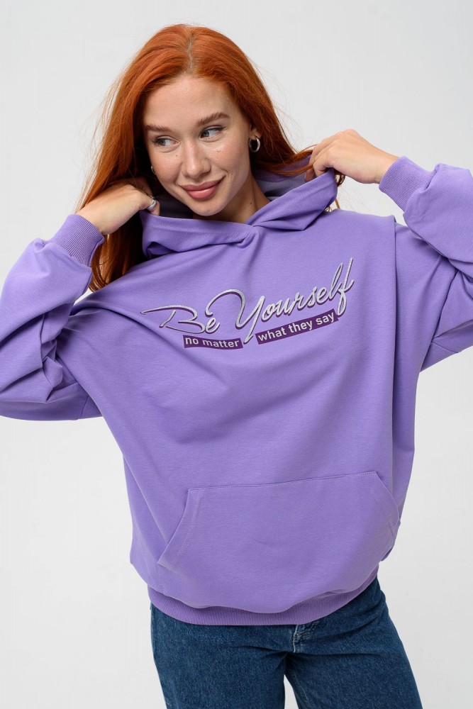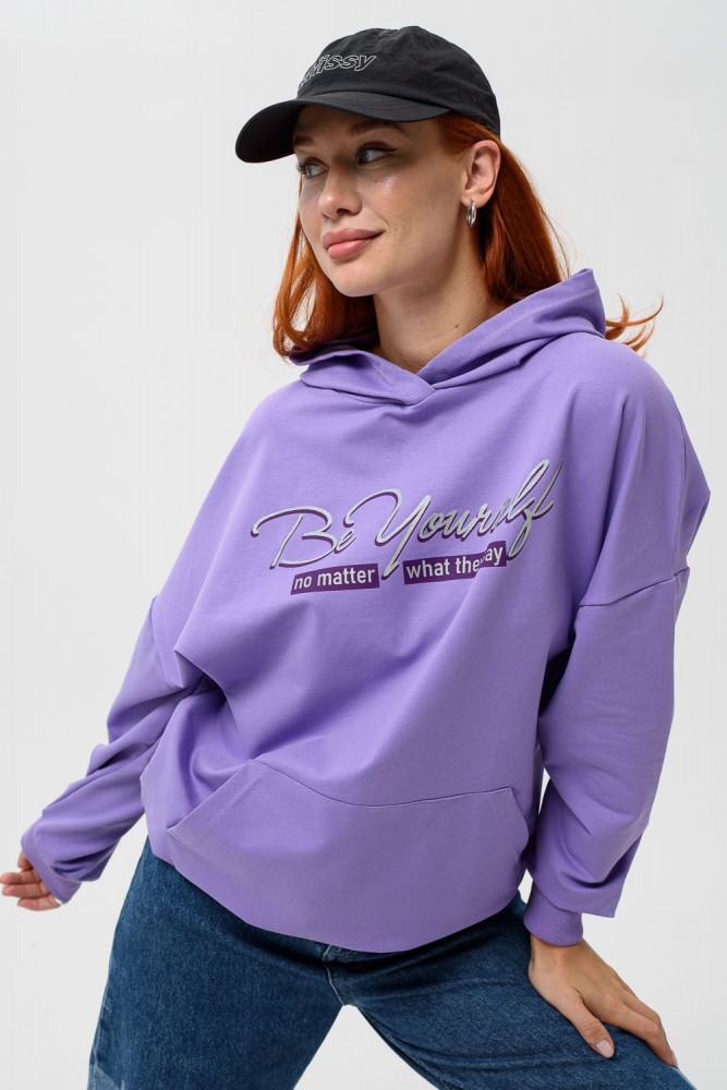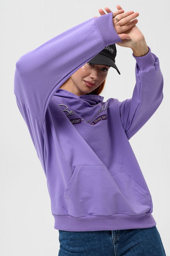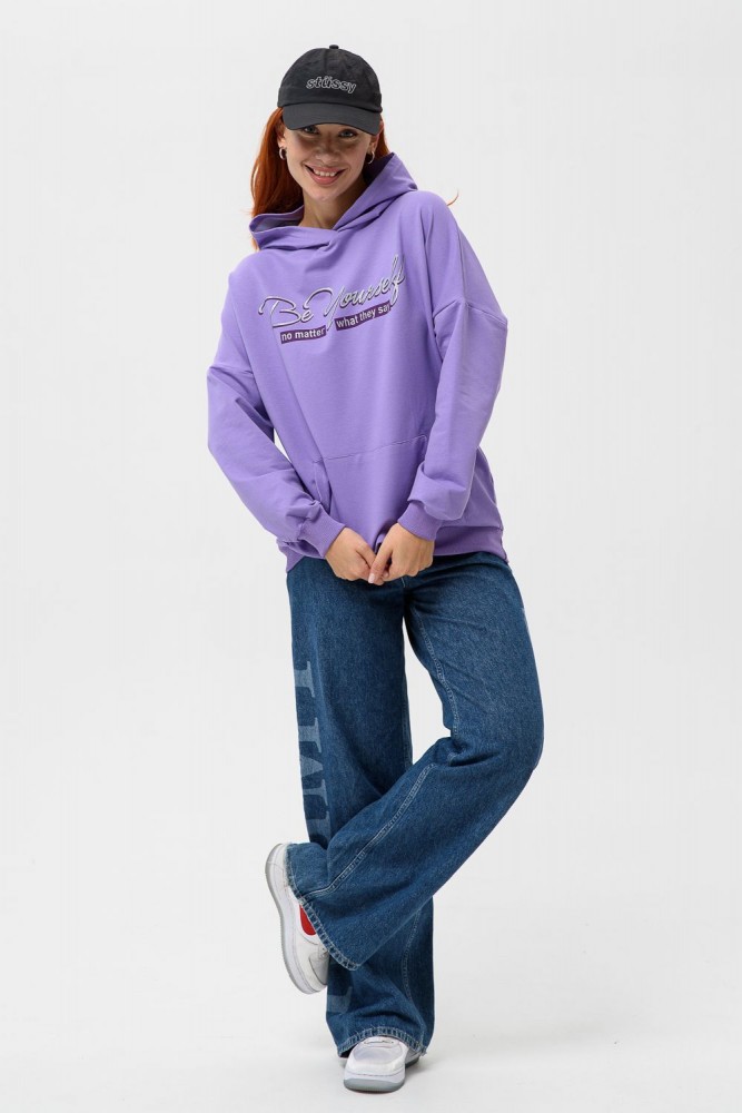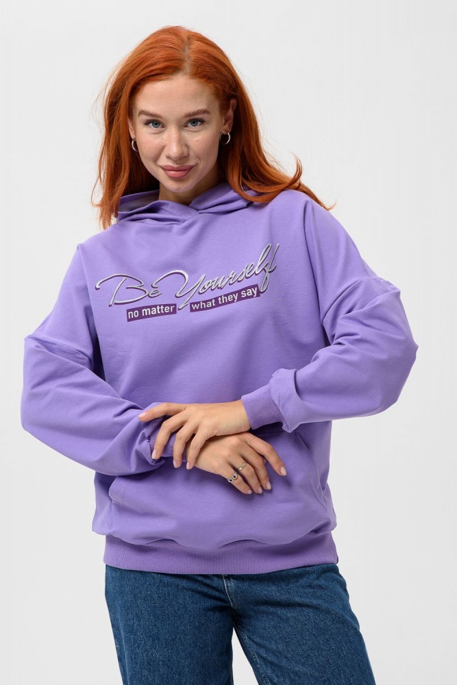 Фиолетовая мода. Слегка удлинённая толстовка в спортивном стиле с карманом кенгуру и капюшоном. Изделие выполнено из футера без начёса. Перевод текста:"Будь самим собой и не важно что о тебе говорят." Линия плеча спущена, рукава удлинённые. В измерениях длина рукава указана от шва втачивания капюшона. Манжеты и низ толстовки обработаны плотной резинкой кашкорсе.