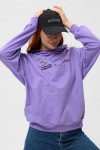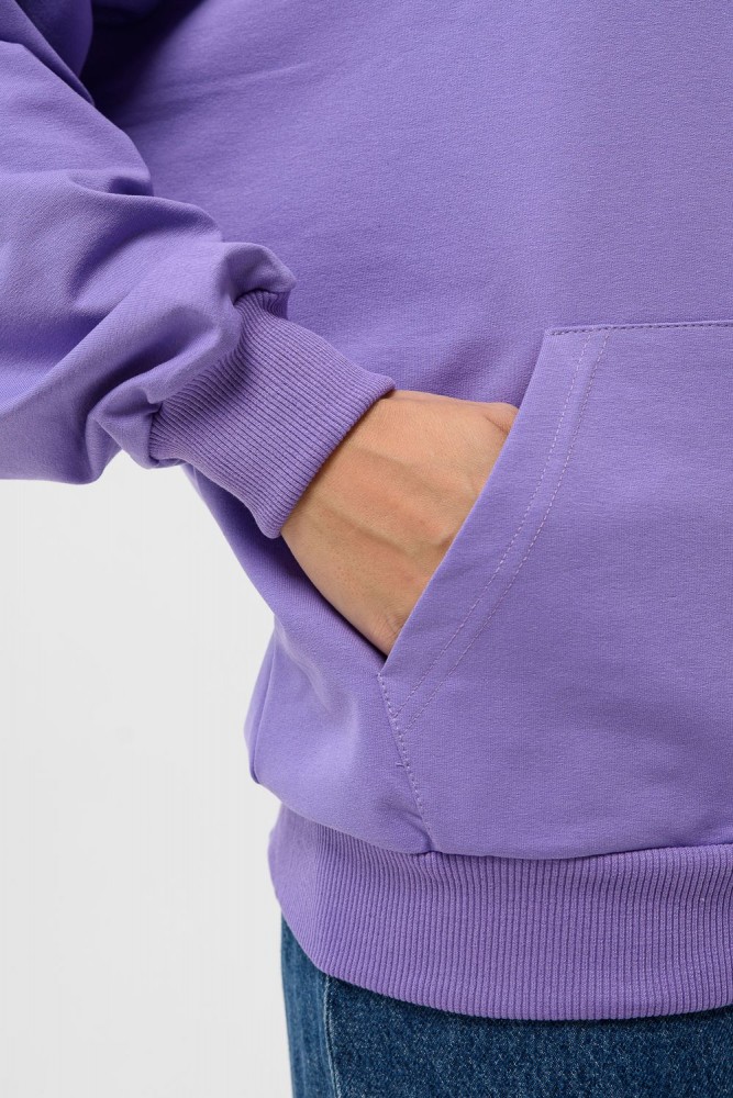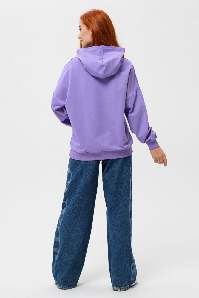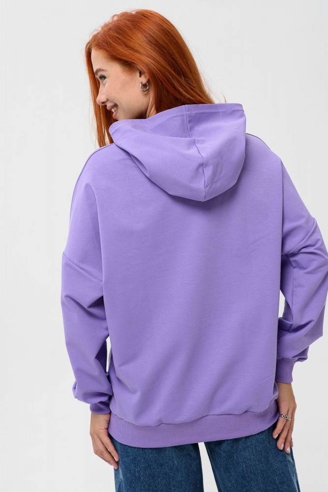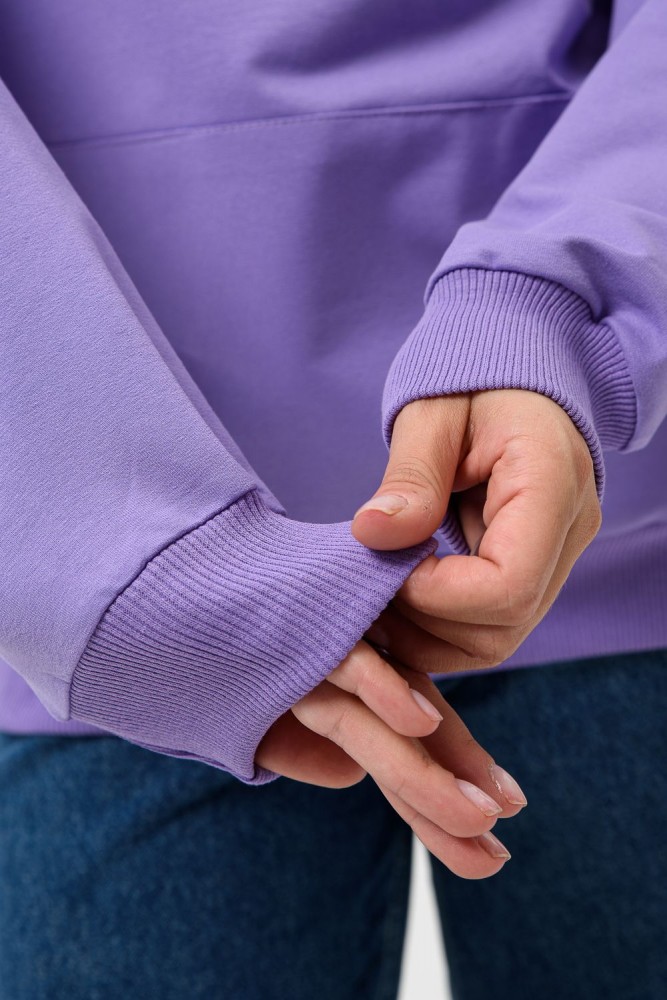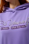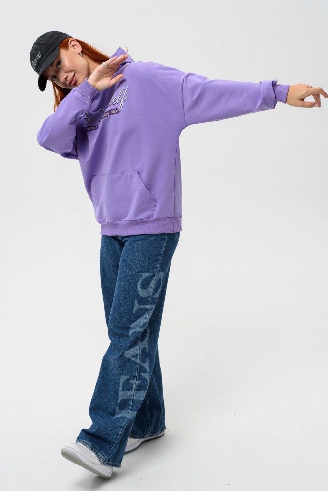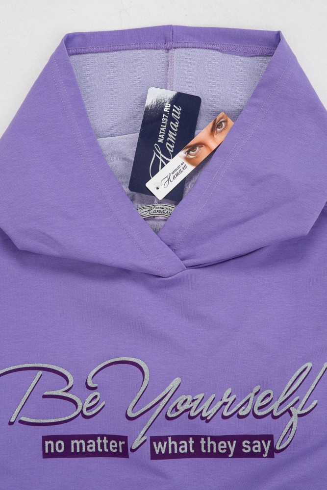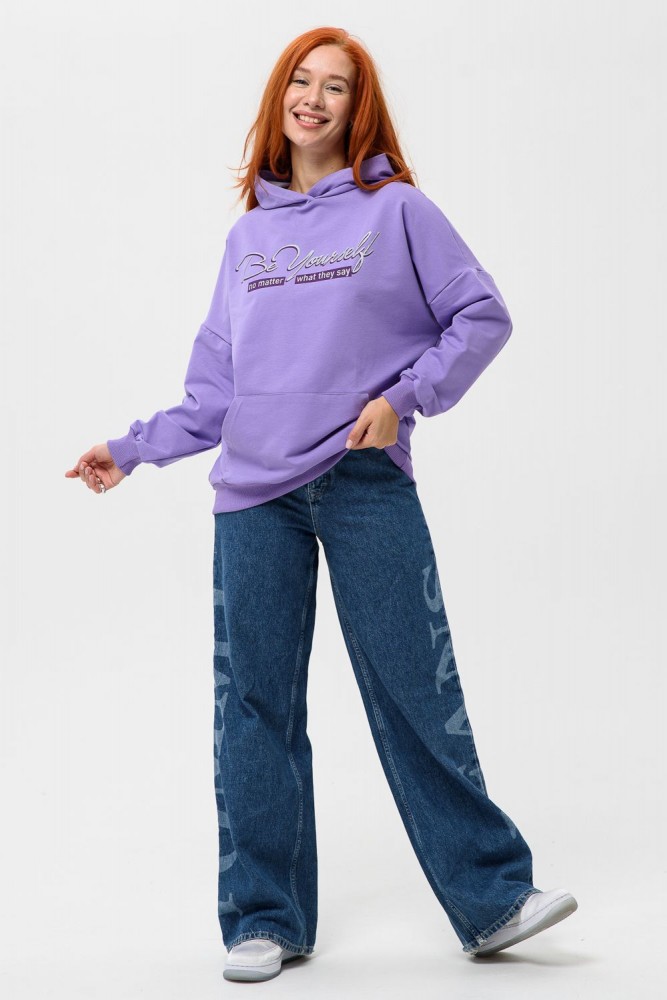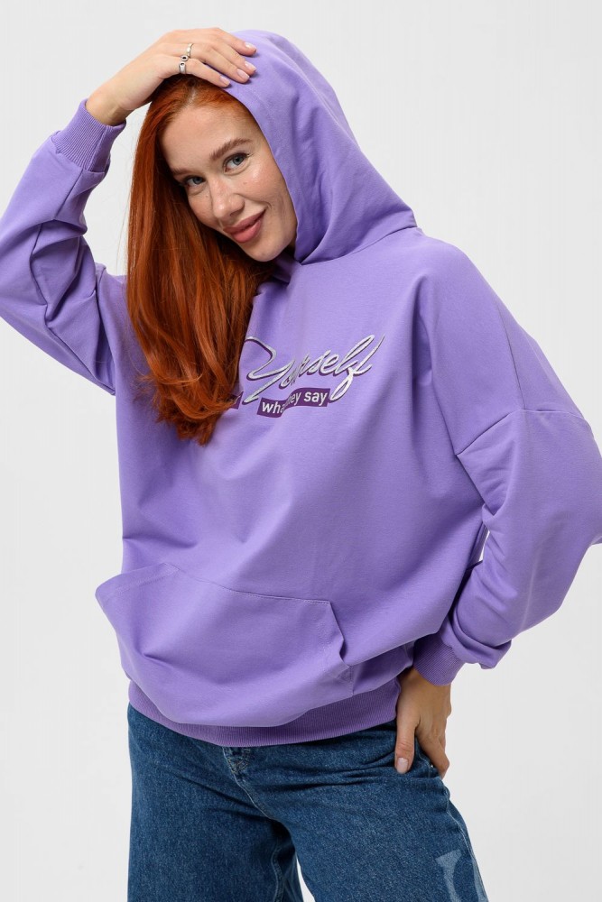 Фиолетовая мода. Слегка удлинённая толстовка в спортивном стиле с карманом кенгуру и капюшоном. Изделие выполнено из футера без начёса. Перевод текста:"Будь самим собой и не важно что о тебе говорят." Линия плеча спущена, рукава удлинённые. В измерениях длина рукава указана от шва втачивания капюшона. Манжеты и низ толстовки обработаны плотной резинкой кашкорсе.