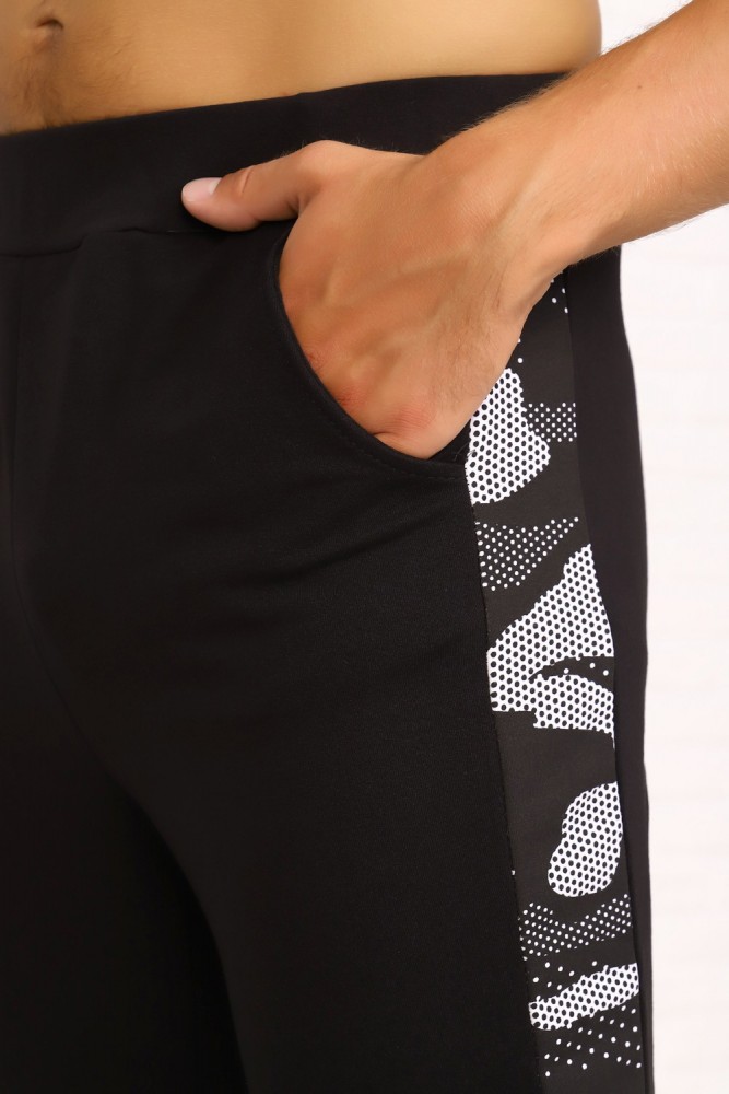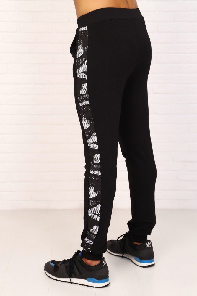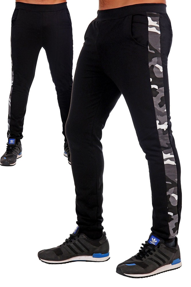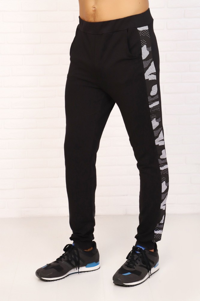 Мужское трико из футера с лайкрой. По бокам вертикальная вставка камуфлированного дизайна, также имеются боковые карманы, внизу манжеты, пояс на резинке.