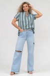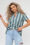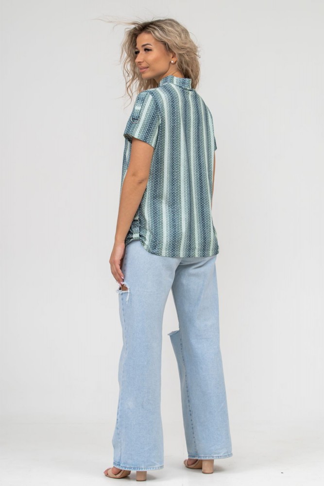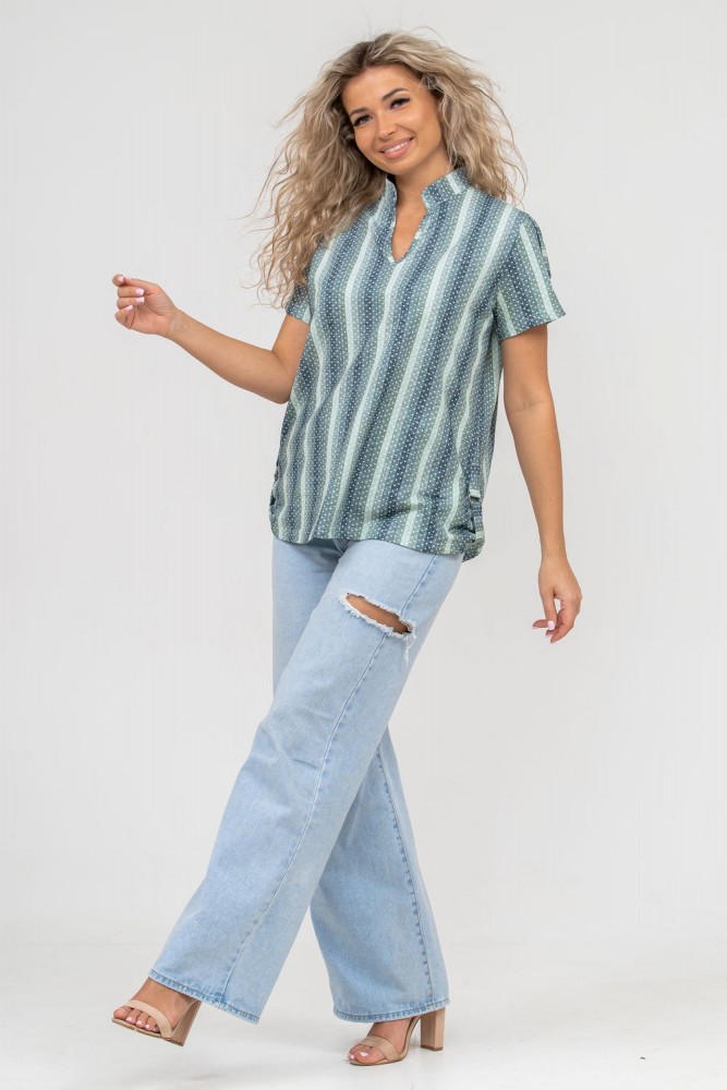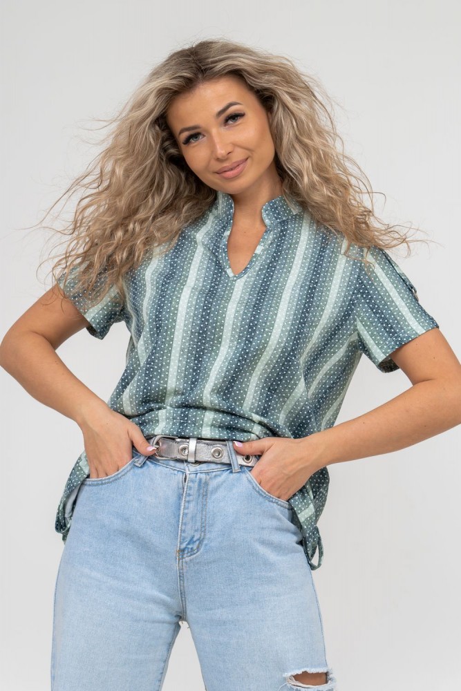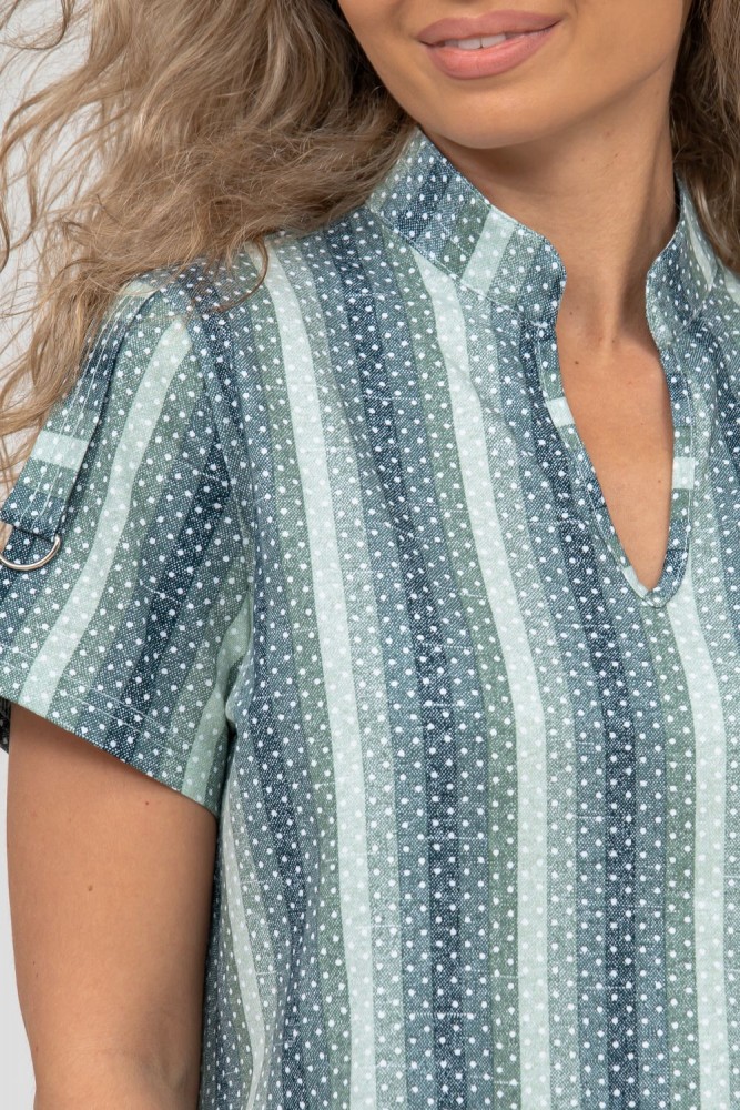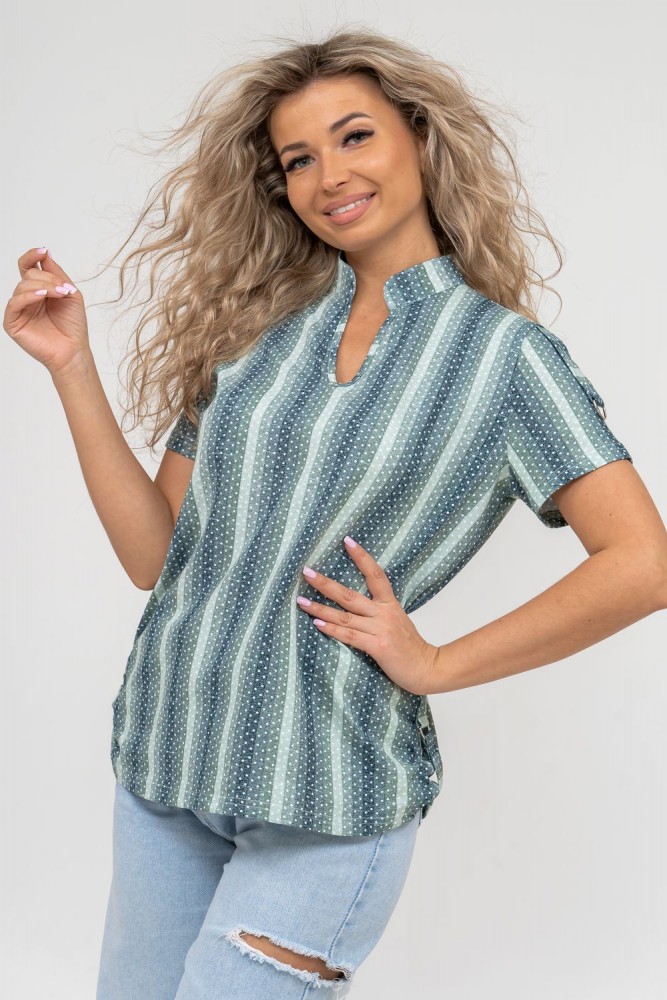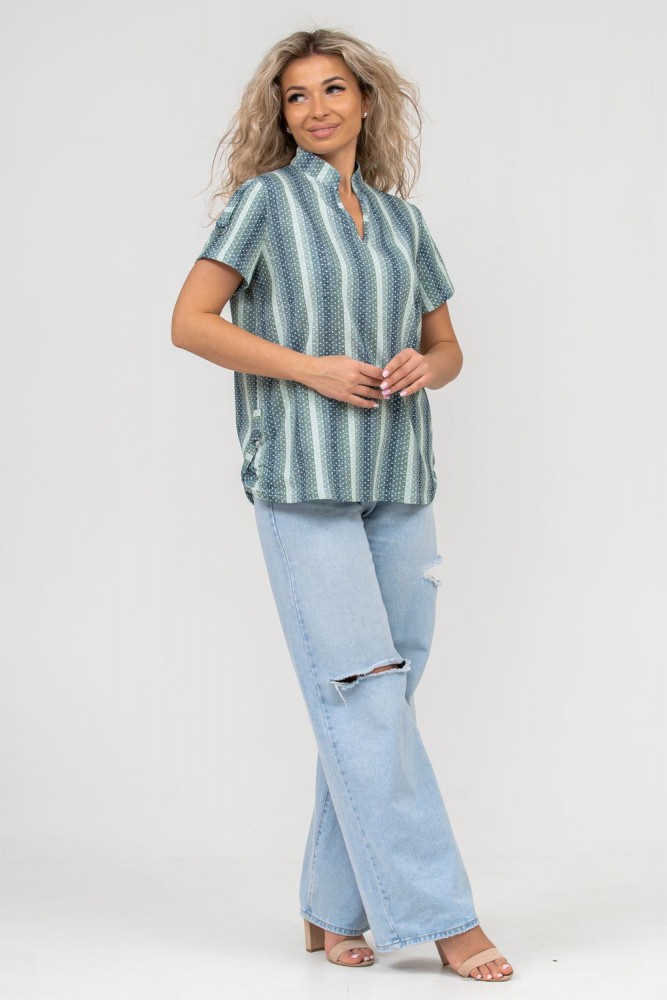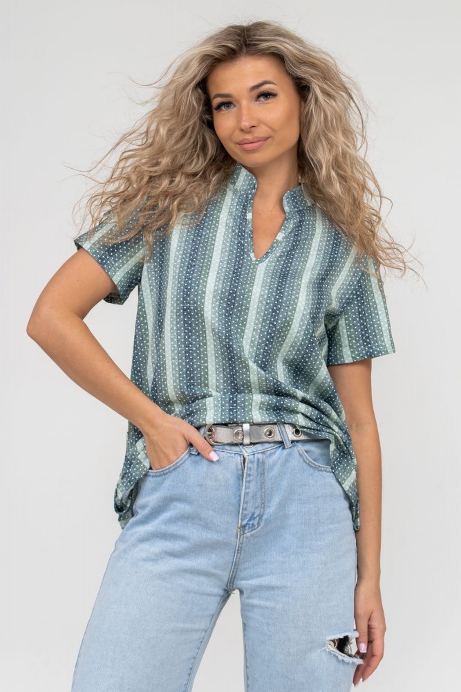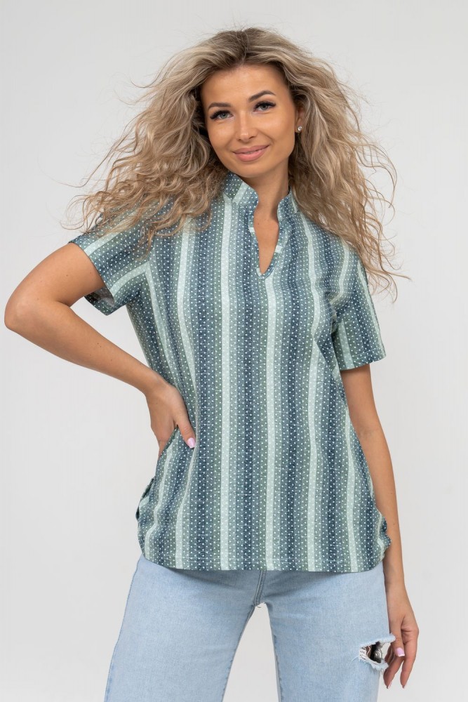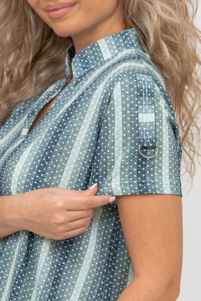 Женская туника-рубашка из 100% хлопчатобумажного полотна, сочетающая в себе всеми любимую полоску и не выходящий из моды горошек. Горловина с V - образным вырезом и воротником стойкой. Рукав и низ изделия с отделкой в виде полуколец, что делает тунику более привлекательной и по-своему красивой.