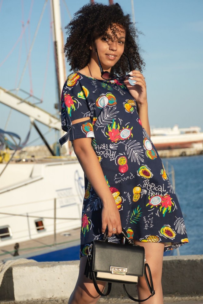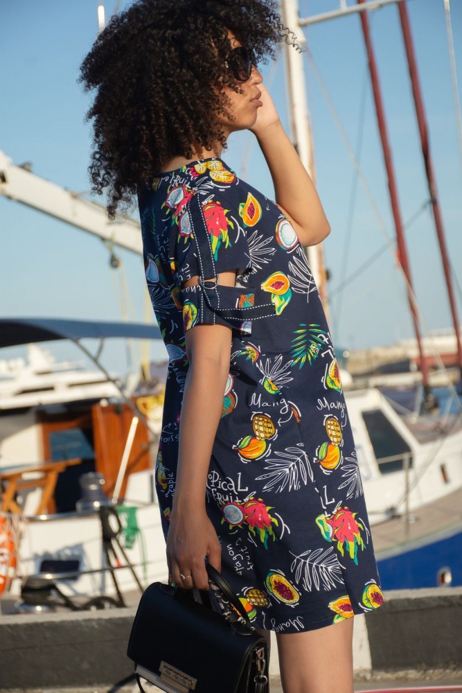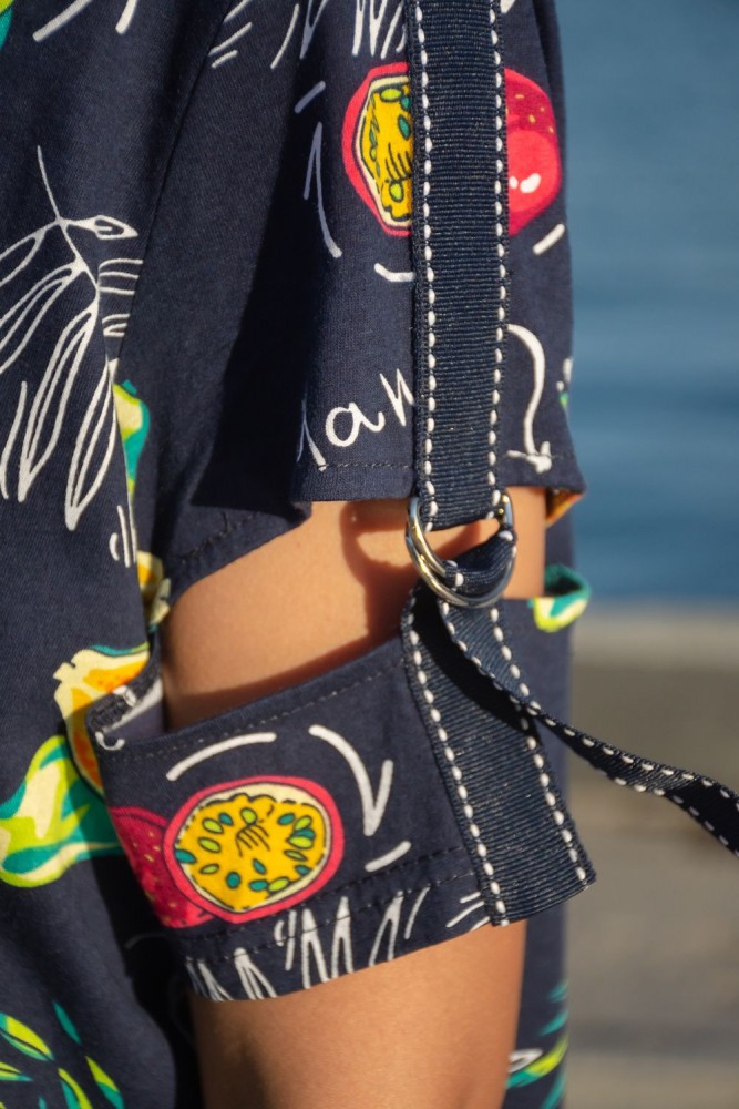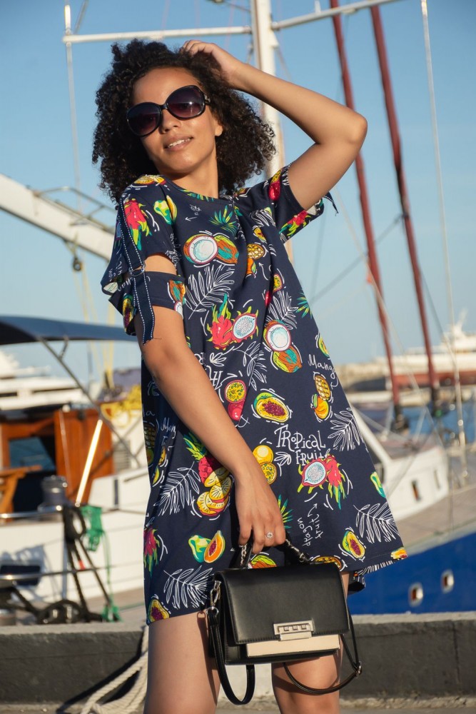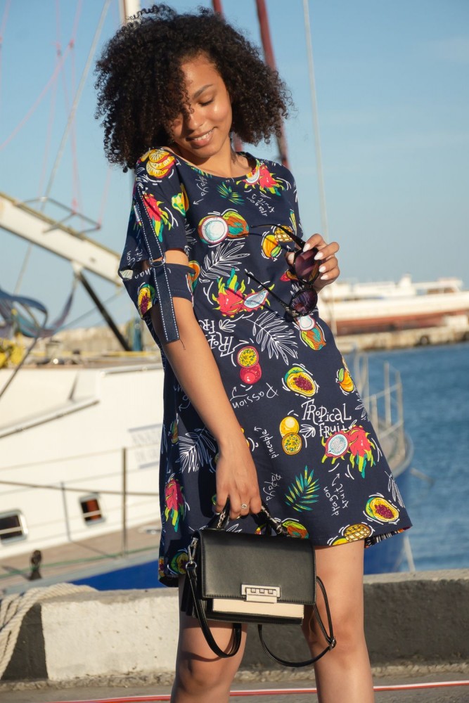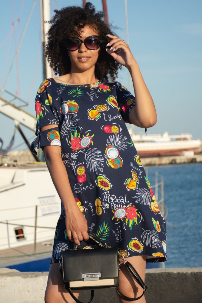 Женская туника А - образного силуэта с боковыми карманами выполнена из 100% хлопчатобумажного трикотажного полотна с тропическим рисунком. Горловина окантована, а интересный рукав с разрезом, металлическими полукольцами и декоративной лентой, позволяет создать изысканный образ, как в повседневной жизни, так и на отдыхе.