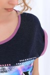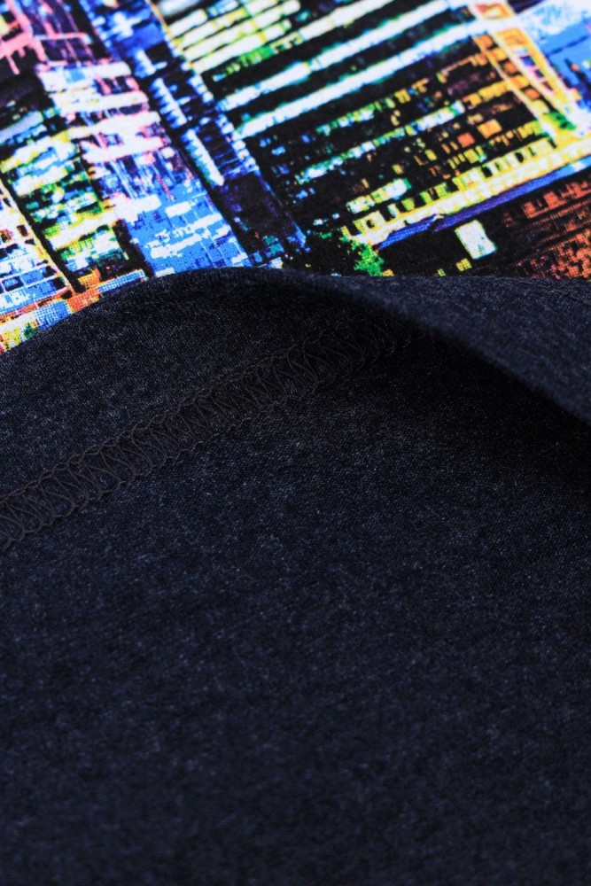 Стильная туника из кулирки. Принт изображает панораму небоскребов Москва-Сити, фиолетовая окантовка. Рукав короткий, длина чуть выше коленей. Оттенок ткани может отличаться